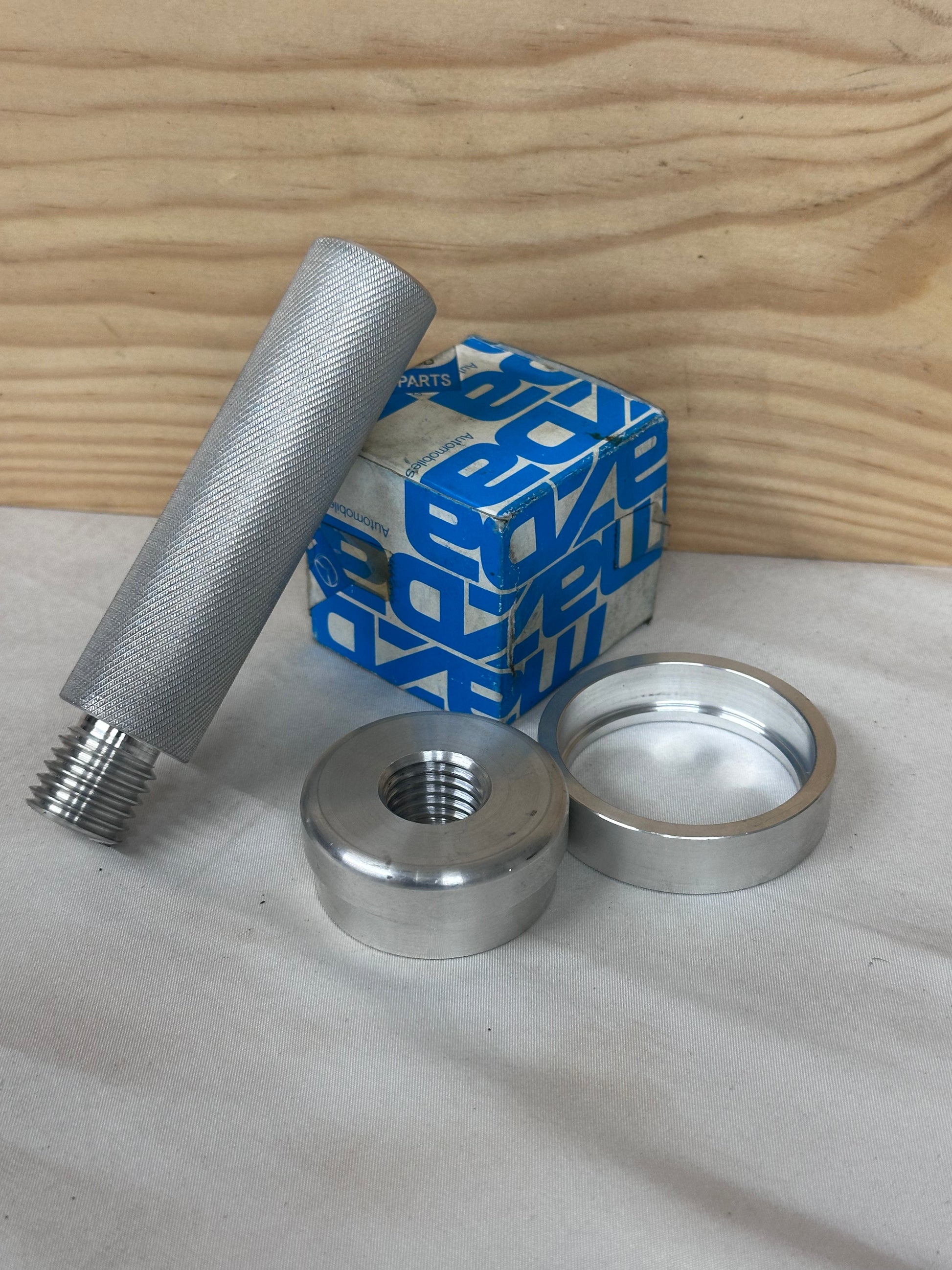 SRRPS Main bearing press tool, has been made the same way "PINEAPPLE RACING" had them made. They are machined from 6061 aluminum so that the press tool is forgiving as not to damage the new bearing but still strong enough for years of service. Kit Includes 1 main piece (to press bearings through), 1 slip on ring piece (to install bearing with a perfect stop) and 1 solid 1 inch threaded handle with a firm grip. (That can be removed from the press tool.)