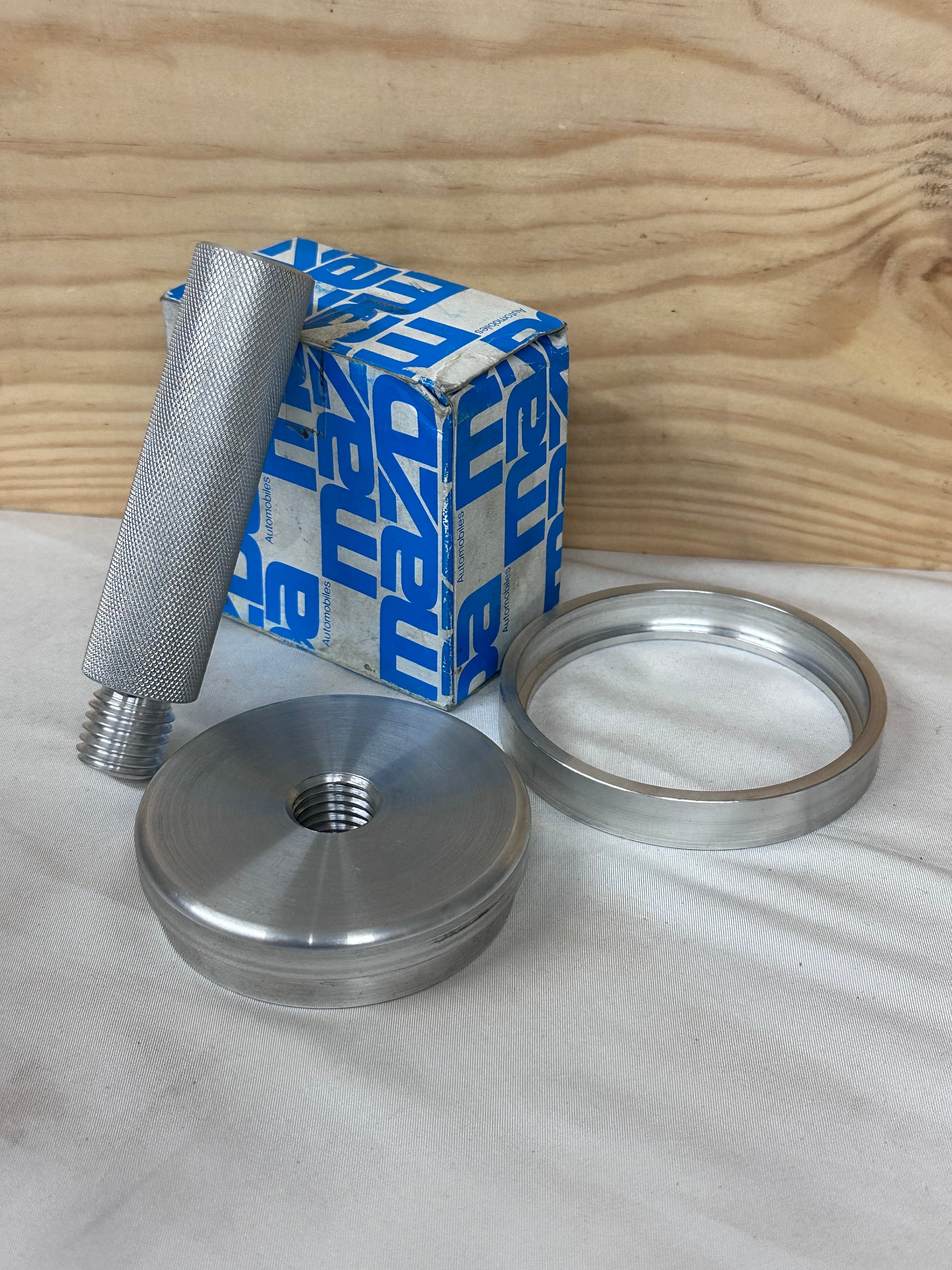 SRRPS Rotor bearing press tool, has been made the same way "PINEAPPLE RACING" had them made. They are machined from 6061 aluminum so that the press tool is forgiving as not to damage the new bearing but still strong enough for years of service. Kit Includes 1 main piece (to press bearings through), 1 slip on ring piece (to install bearing with a perfect stop) and 1 solid 1 inch threaded handle with a firm grip. (That can be removed from the press tool.)
